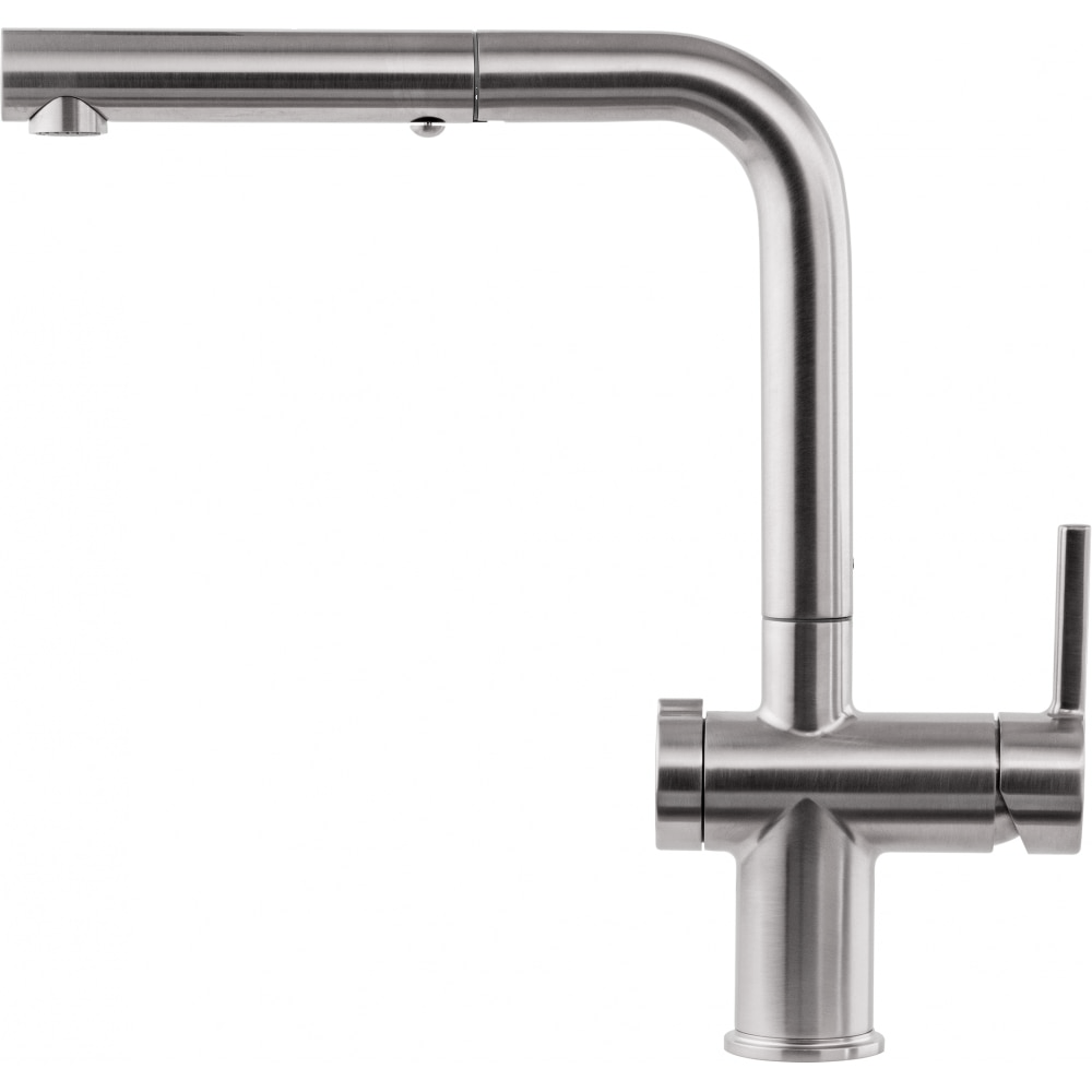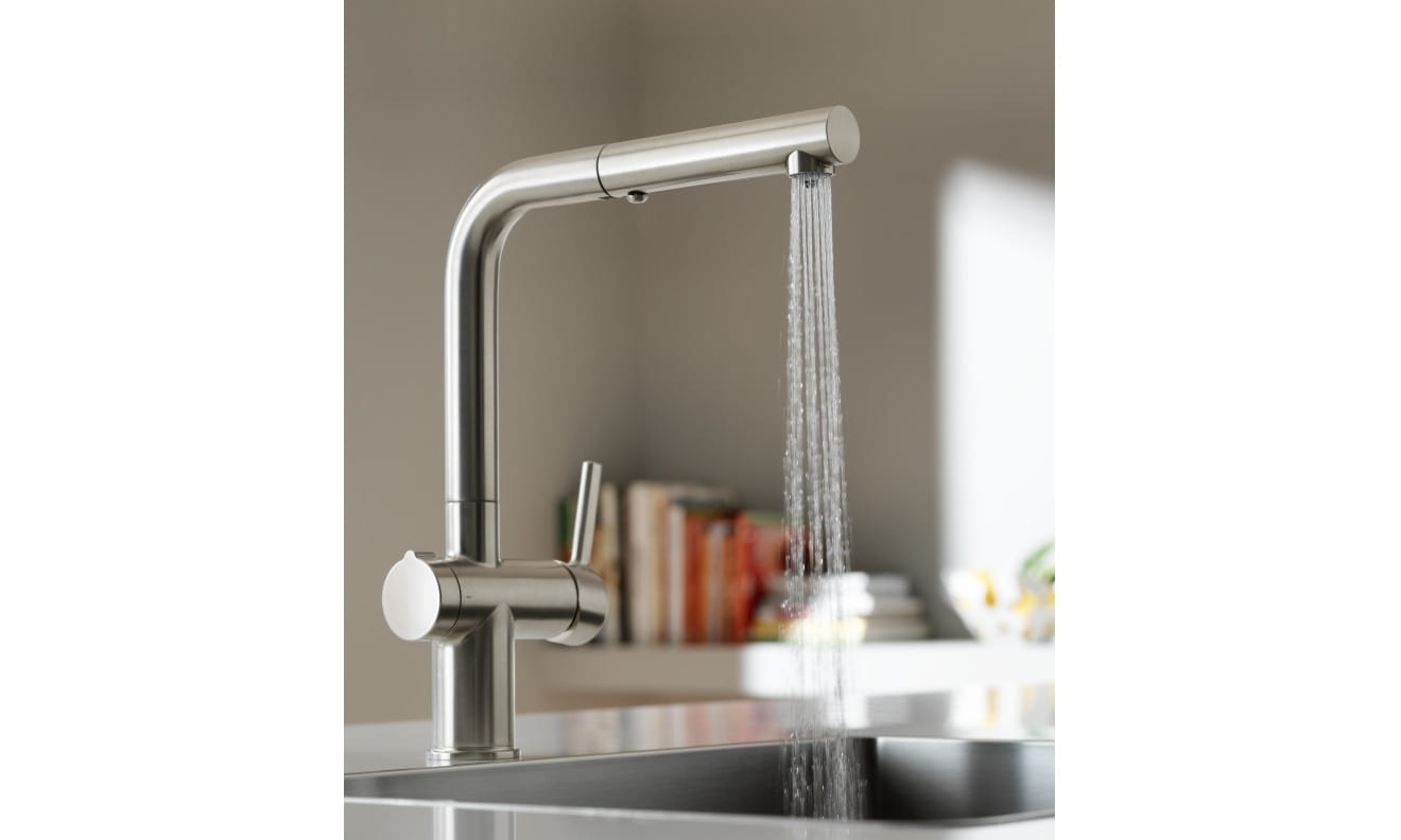 Bateria kuchenna z wyciąganą wylewką z funkcją prysznica Active L Twist pull-out spray w wykończeniu stal optyczna. Bateria Active Twist wyposażona jest w funkcję sterowania korkiem automatycznym odpływu zlewozmywaka, dzięki czemu zachowasz czystość i higienę w Twojej kuchni. Już nie musisz wkładać rąk do wody po zmywaniu naczyń, żeby wyciągnąć korek, bo mechanizm otwierania i zamykania zlewu to integralna część baterii – po obróceniu pokrętła odpływ otwiera się i woda łatwo i higienicznie wypływa ze zlewu. Ten model posiada również ceramiczną głowicę, laminarny strumień, który eliminuje większość rozprysków oraz technologię Eco, która pozwoli Ci oszczędzać wodę i energię.