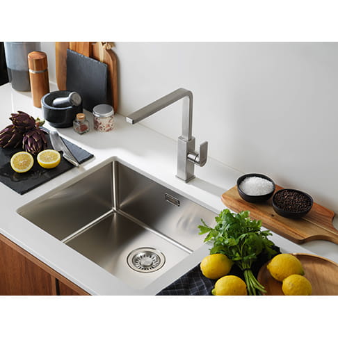 Charakterystyczny dla firmy Franke kran z litej stali nierdzewnej dostępny w wykończeniu szczotkowanej stali nierdzewnej i czarnej stali przemysłowej
