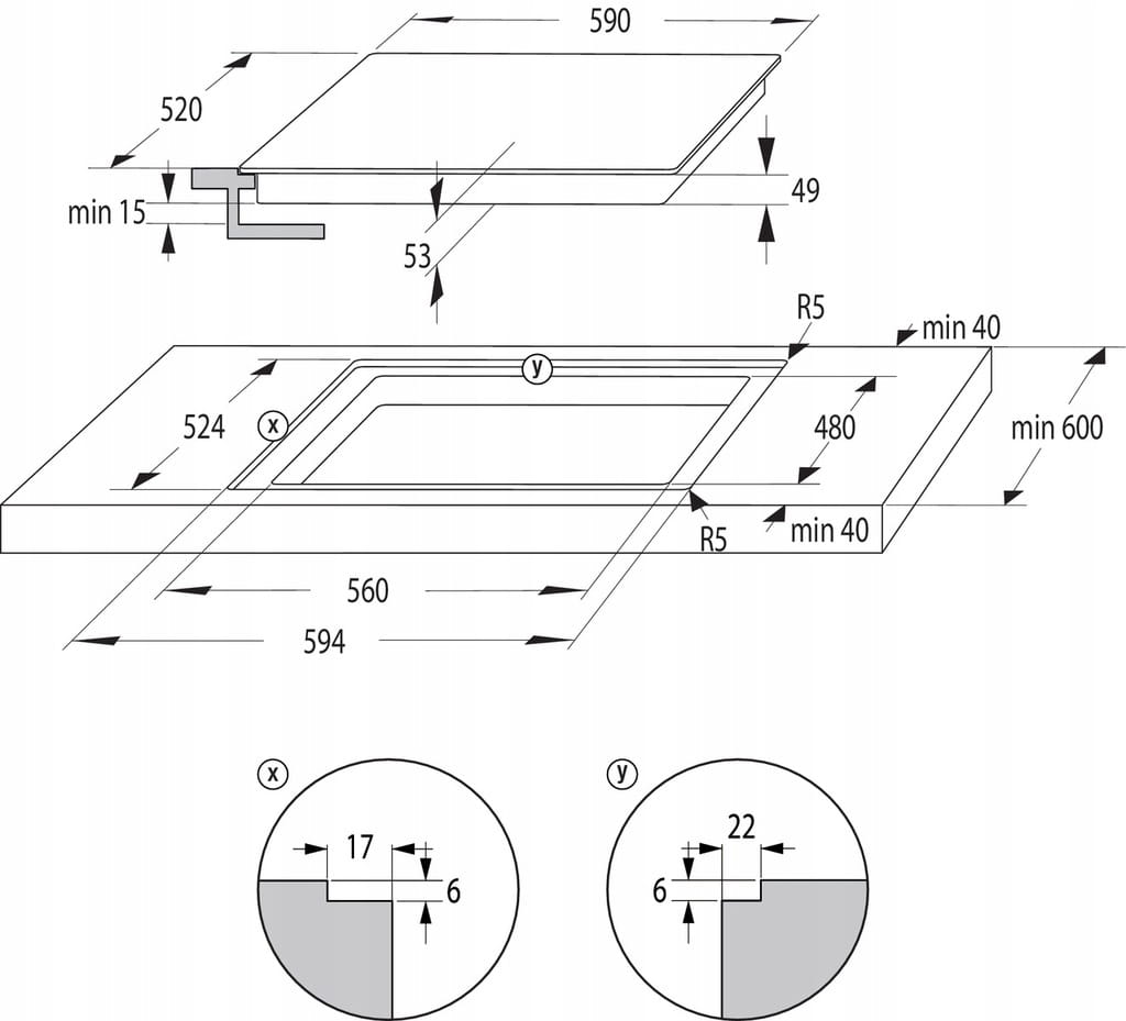 - Głębokość wnęki do montażu min. 480 mm