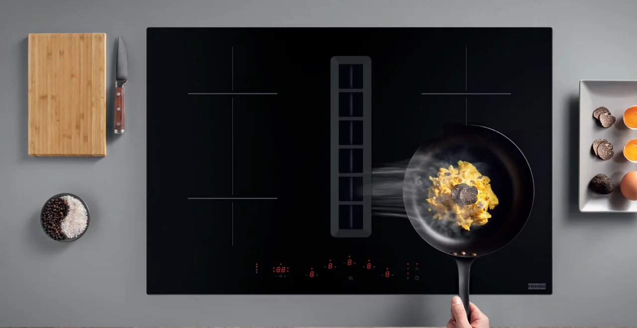 Smart 2gether Ellipse FSM 7072 4RC HI FRANKE jest urządzeniem typu dwa w jednym. Składa się z płyty indukcyjnej połączonej z wbudowanym okapem. Okap uruchamia się automatycznie po włączeniu płyty i dostosowuje moc pochłaniania do poziomu intensywności jej pracy. Wlot zlicowany jest z powierzchnią płyty, co umożliwia przesuwanie naczyń bez konieczności ich podnoszenia. Bezramkowa płyta indukcyjna z czarnym szkłem może być wbudowana w blat lub zamontowana na równi z blatem. Płyta oraz okap są obsługiwane za pomocą panelu dotykowego na szkle, a wszystkie elementy elektroniczne, łącznie z silnikiem, są wodoszczelne na wypadek zalania. Okap przystosowany do pracy w trybie otwartym.